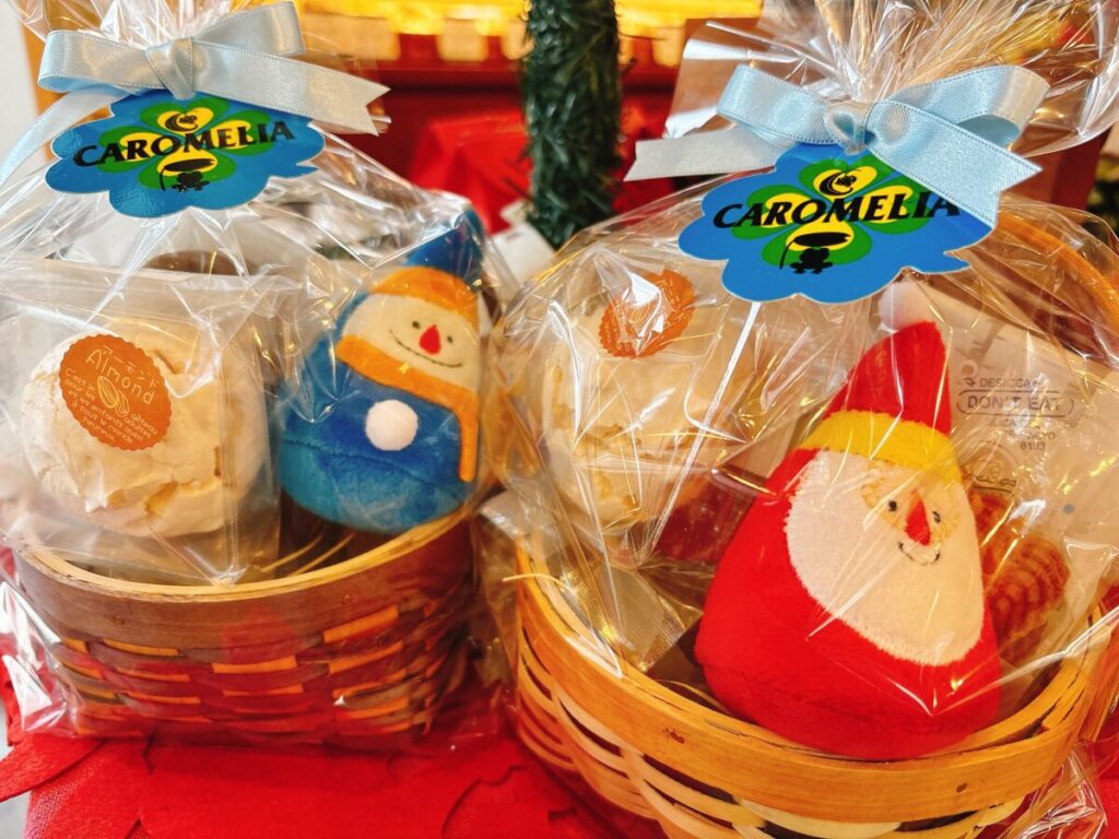 赤と青のドロップサンタさんマスコットが入ったカゴ入りギフト★クリスマスプレゼントにとっても喜ばれますよ~