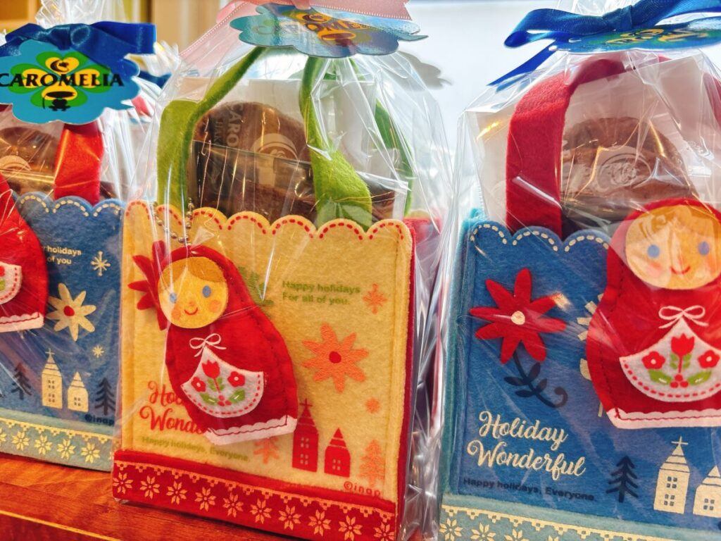 今年はこんな可愛い「マトリョーシカ」がお出迎え 2025年12月30日 Filed under: スタッフのおすすめ カロメリア 小さめミニバックギフトや人気のバケツ缶ギフトも是非!!可愛らしくお洒落な人気の高いギフトです★ ベージュと青の2種類のカラーからお選びいただける当店今年のNEW!「マトリョーシカバック」とっても可愛くって思わず手に取りたくなるかもしれません!ご来店の際には是非ご覧ください カンカンSNOWお正月バージョン新登場!バケツの中にはたくさんのお菓子が詰まっています!食べたあとも利用できるうれしさがあるギフトです♡