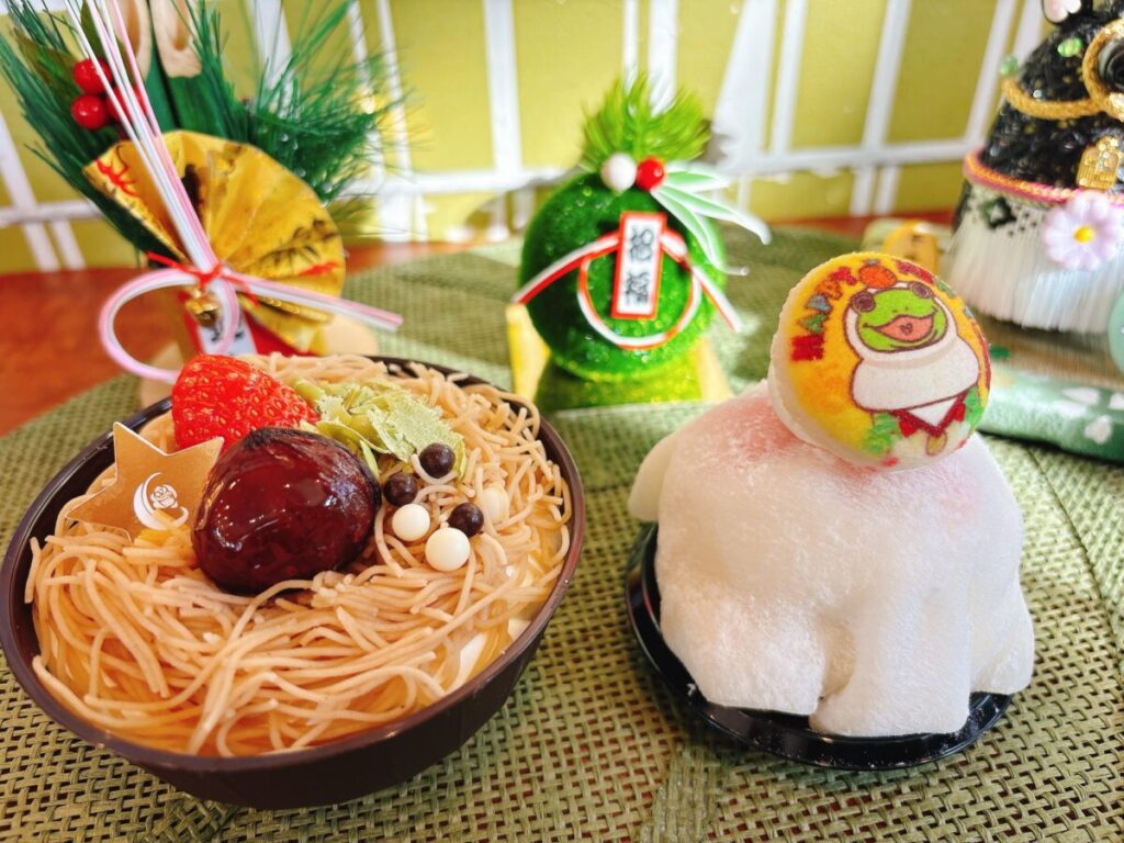 毎年恒例12/30・31だけの特別年越しマウンテン 2025年12月30日 Filed under: 季節のおすすめ カロメリア 新春ケーキがいろいろ~中でも和栗100%でおつくりする普段も特別なケーキとして人気高いカロメリマウンテン!年越しそばに見立てた風貌が可愛らしいと人気です!今年も是非年越しマウンテンしてください! 和栗100%でおつくりする「年越しマウンテン」写真右側 柔らかな求肥でお包みした「かがみ大福」を是非ご賞味くださいませ☆彡