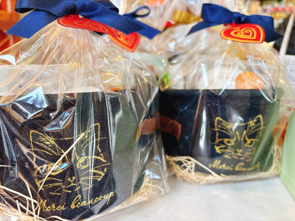 デニムミューは今年のNEW!!デニム生地の布バケツにおススメお菓子をお詰めいたしました!おシャレでかっこいい!贈りものにも是非どうぞ