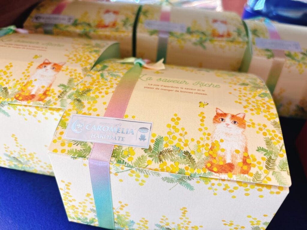 メルミモザはイエローカラーにネコとミモザのイラストが可愛らしい人気のギフトです♡お菓子4点入りの人気商品となっております※なくなり次第終了