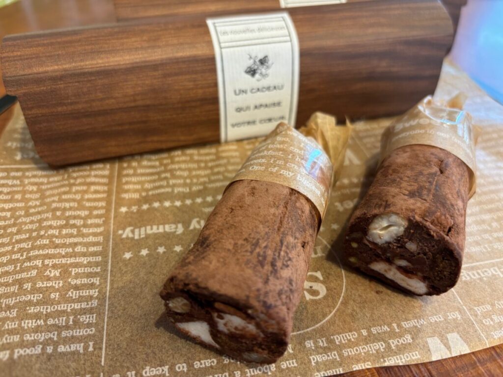 CAROMELIAの『ソシソン・オ・ショコラ』 2026年2月5日 Filed under: スタッフのおすすめ カロメリア ソシソンとはフランス語で「サラミ」を意味します♡見た目が面白く可愛らしく美味しいのです♡なめらかな生チョコにナッツやレーズン・マシュマロを混ぜることで切ったときの断面がまるでサラミのよう♥バレンタインの贈り物に日どうぞ♡ 生チョコのなめらかさが際立つ美味しさ♥思わず「おいしい~」と声が出ますよ♡柔らかな食感とナッツ等のカリカリ感&マシュマロのふわっと感が相まってなんとも新しい味!スタッフおススメの一品です