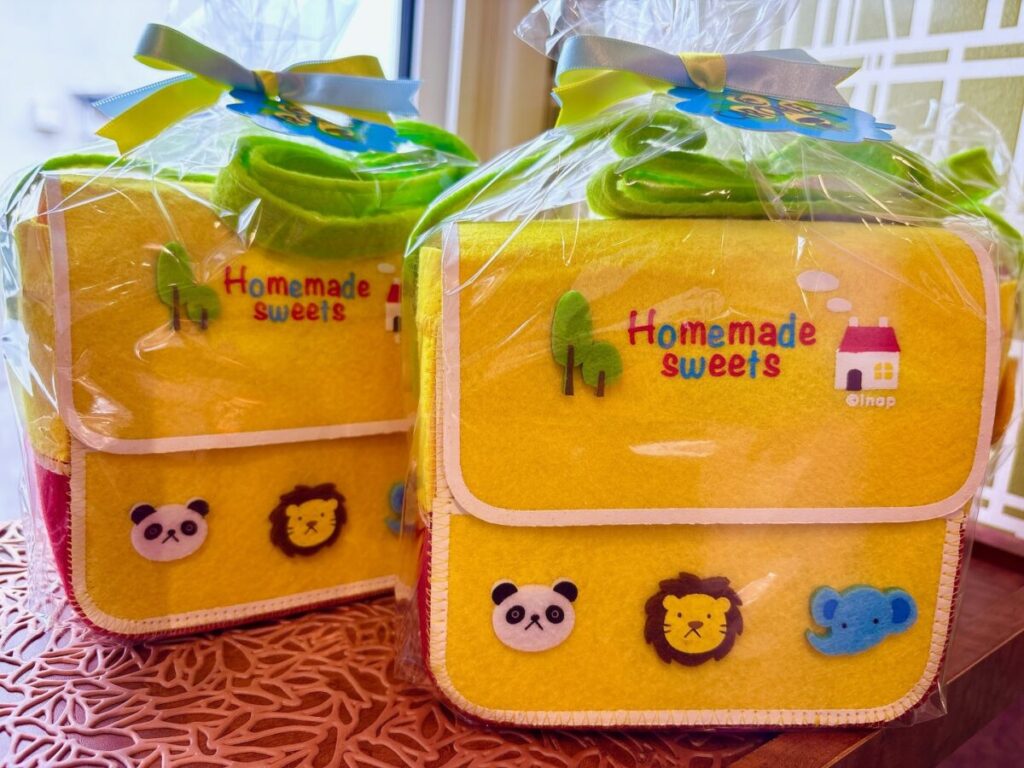 黄色が映えるかわいいようちえんバック★お菓子を食べた後はバックをしょって「いってきま~す」なんて聞こえてきそう✿日々育っているお子さまやお孫さんの素敵な記念日にどうぞ