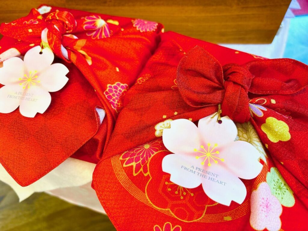 鮮やかな赤に梅や菊等たくさんの花が描かれた素敵な風呂敷でお包みした「風呂敷ギフト」は人気の商品となっております✿日本らしく…日本人らしく…和に触れてみてはいかがでしょうか