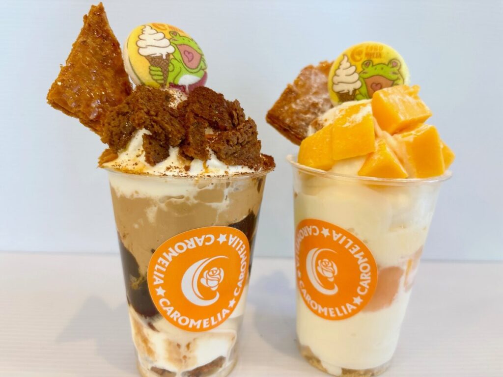 コーヒーの芳醇な香りとカフェパンナコッタのミルク感がたまらない珈琲ゼリーソフトパフェ!と一口食べたら南国気分を味わえちゃうジューシーなマンゴーにピーチジュレのフレッシュさを加えたマンゴーソフトパフェ★是非ご堪能くださいませ★