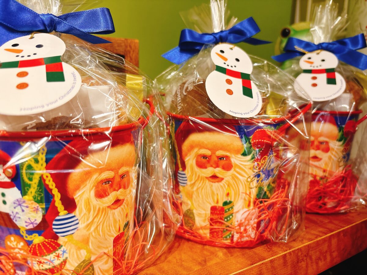 2種類のカラーバスケットの中にはたくさんのお菓子とドロップサンタさんが入っています♪可愛らしさ満点のクリスマスギフト