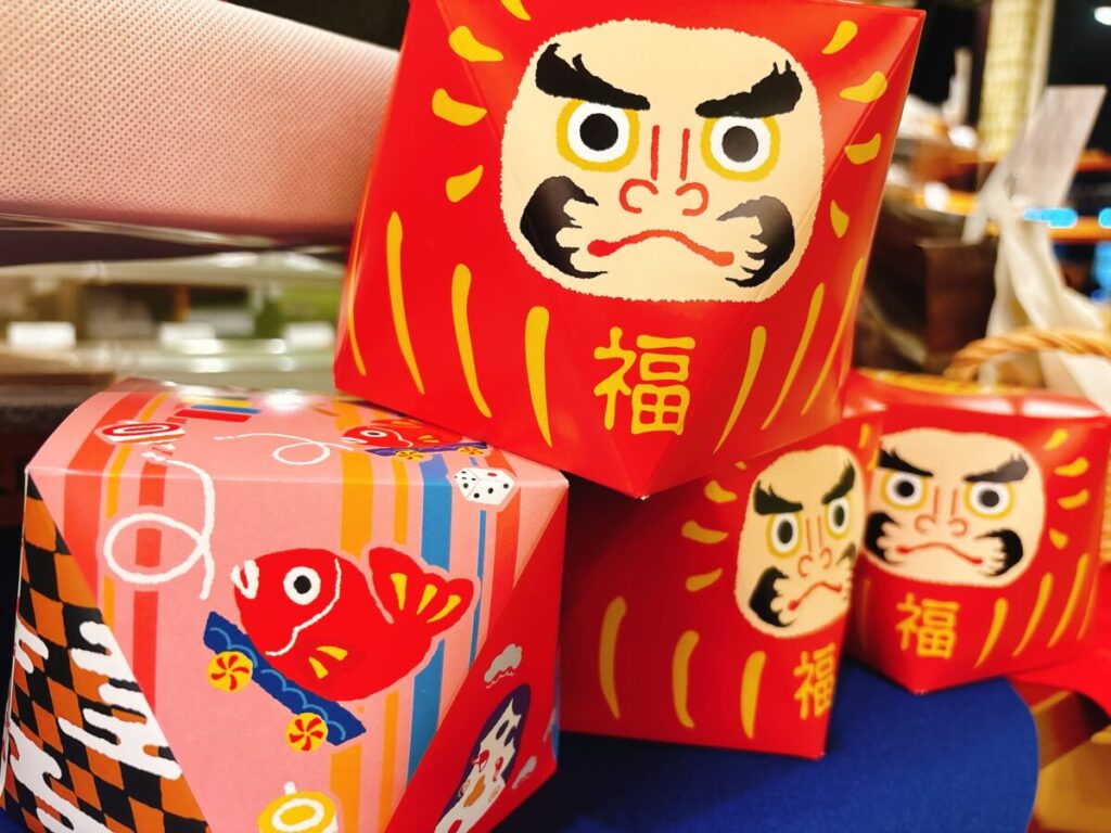 お正月は縁起良く!タイやだるまや招き猫が描かれた晴れやかな絵柄と可憐な椿の絵柄の3種類よりお選び頂ける四季のギフトシリーズがおススメ!