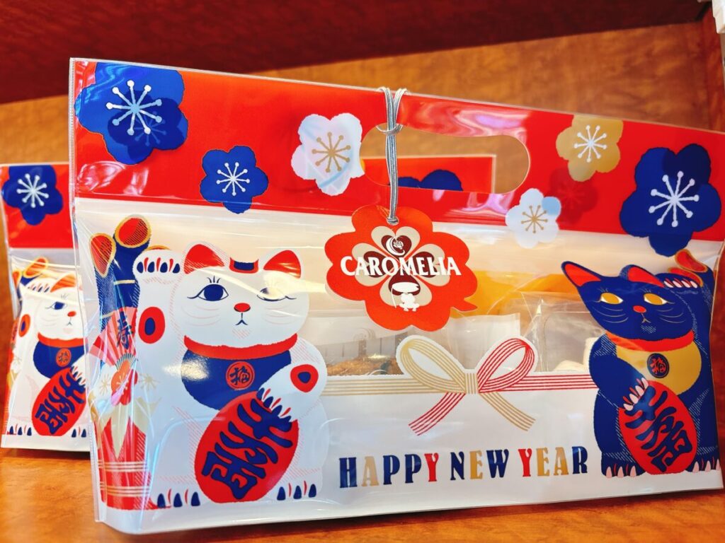 招き猫は前足で人を招くといわれ商売繁盛の縁起物黒猫まねきは厄除けにも!日本らしくお正月らしさが詰まったお菓子ギフトです