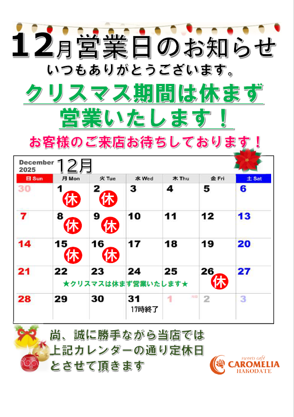リンリンリン♪ランランラン♬クリスマスがやってきます★寒さが一段と増しとっても寒い日々が続きますね!クリスマス当日は店頭ショーケースにもXmasホールケーキや単品のケーキも並びますので是非ご来店くださいませ♡またクリスマスケーキの他にもシュトーレン&米粉クグロフ★XmasマカロンやXmasGIFTもたくさんご用意しております!皆様のXmasが楽しい日となりますように♡