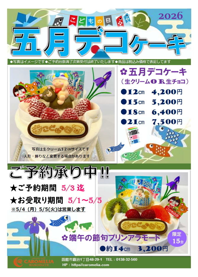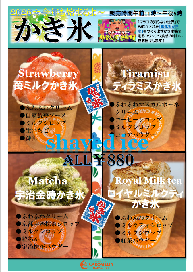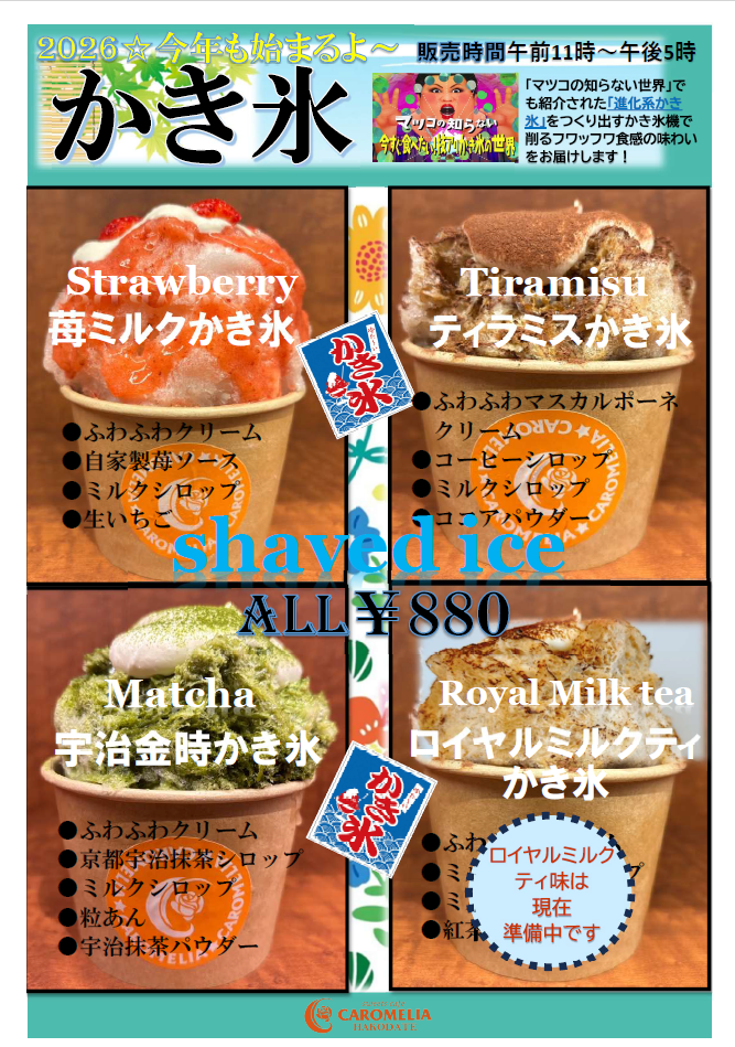 桜前線が函館にもやってきました✿暖かで穏やかな春の季節にスイーツ食べてお花見しながら楽しく幸せなひと時をお過ごしくださいませ✿カロメリアではお客様におくつろぎいただけるよう外にベンチとテーブルを設置しております★4/15よりかき氷の販売も始まりました!お好きなスイーツで心もお腹も満足いただけますように!お客さまのご来店心よりお待ちしております